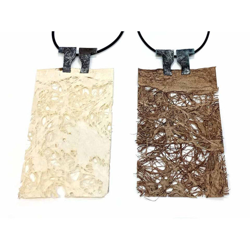 Escultura y grabado unidos en un colgante de metal y papel. Blanco y oxido que se dan la mano.